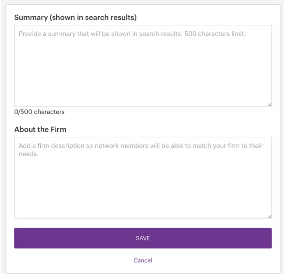 Click on "Firm Profile" in the menu that appears beneath your name in the top right corner. Near the top of this page, you’ll see three categories, "Info," "Practices" and "Locations." You’ll initially be on the "Info" tab, but if you’re not, click on "Info." On the top left, you’ll see your firm's bio summary and full profile (see “About the Firm”). We have completed a preliminary version of the Summary on your behalf. You can edit this, and the full profile, by clicking the pencil icon in the top right of the section. The Summary is limited to 500 characters. Remember that the Summary is the text that is displayed in the search results when your firm is matched on a search. Please review and make changes to the Summary, as needed. You’ll also see your firm’s profile (About the Firm) where Firm Administrators can provide the full text that will be displayed when a Member clicks on your firm after it appears in the search results.