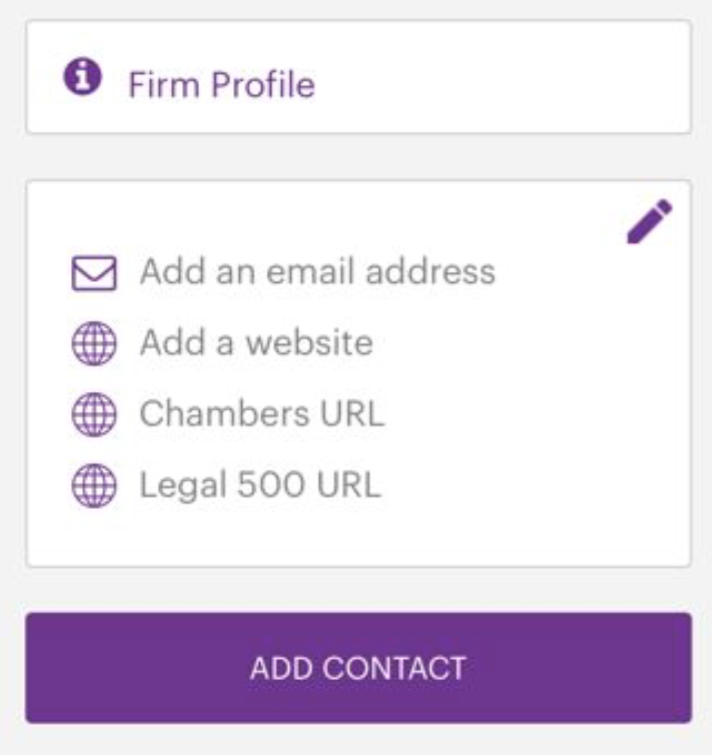 On the far right side of the page, you’ll see other important information, which you may also edit by clicking on the associated pencil icon. Check to make sure the correct firm email address and website are listed. If you are Chambers or Legal 500 ranked, make sure you have that URL entered. Finally, on the bottom left of the page, you’ll see relevant contact information, which is also editable. If you wish to add another contact, please click on the "Add Contact" button on the bottom right of the page.